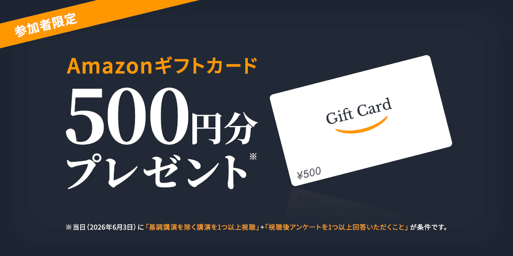 「Amazonギフトカード500円分プレゼント」は、本カンファレンスに申し込みの上で、当日(2026年6月3日)に「基調講演を除く講演を1つ以上視聴」+「視聴後アンケートを1つ以上回答いただくこと」が条件です。※基調講演視聴は対象外です。
